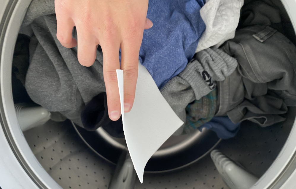 It seemed unrealistic to say the least, but we didn’t have any other laundry detergent around so my fiancé took just one sheet, put it in the washing machine and turned it on, and we all patiently waited for the results.
